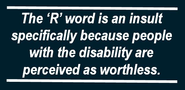 “The people who ‘ARE’ what the ‘R’ word refers to… have been torn from families and cast into institutions. They have been beaten, hosed down, over medicated, under nourished, sterilized, brutalized, victimized.